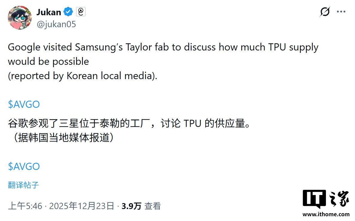 IT之家援引博文介绍,在访问期间,双方不仅讨论了技术细节,还重点商讨了三星未来可能供应的 TPU 数量。这一动向表明,谷歌寻求更具优势的生产方案,正计划将其自研 AI 芯片的制造业务部分外包给三星。